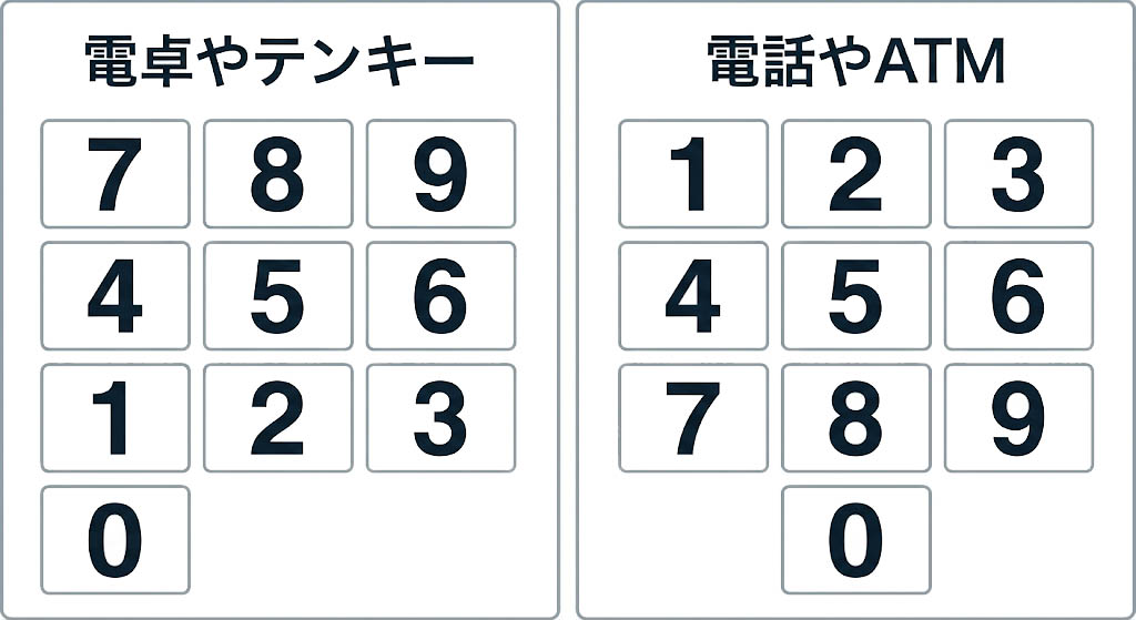 電卓やパソコンのテンキーを使うときと、スマホの電話画面やATMで数字を押すとき。